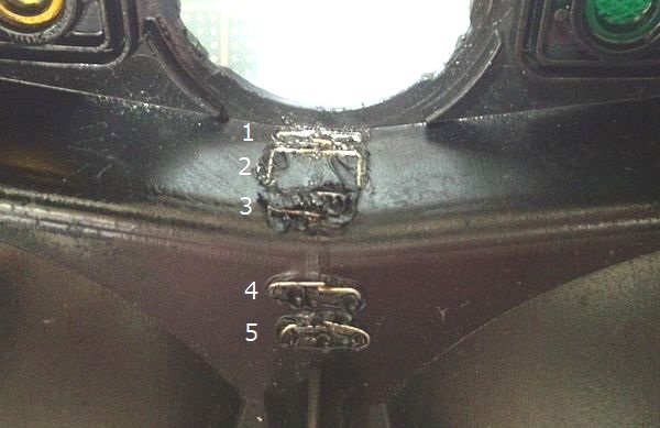 カバー裏、上部は割れ補修、補強に5個、下部に割れ予防の2個 を埋め込み。