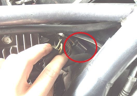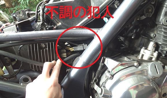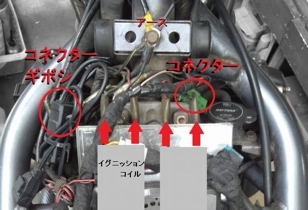タンク下、右側のコネクタ、イグニッションコイルへ向かう線上にある。これも重要箇所だから以前スプレーしてるな。