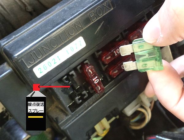ジャンクションボックスのフタを開けるとヒューズがあります。ヒューズを抜いてここの接点にスプレー。
