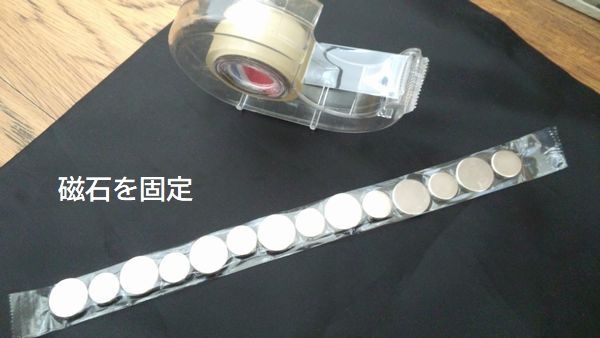 たくさん並べた磁石の列をセロハンテープで固定する。