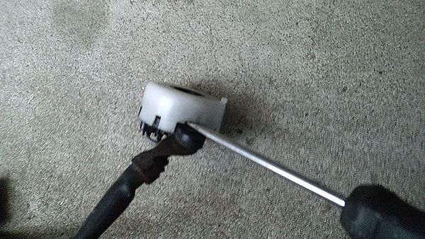 さて核心部分へ。 (-)ドライバーを差し入れて捻ると白いフタが開く。