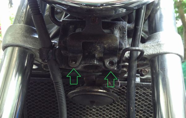 2. ヘッドライトケースは下部の固定ボルトを2本、10mmレンチで外してから取り外す。