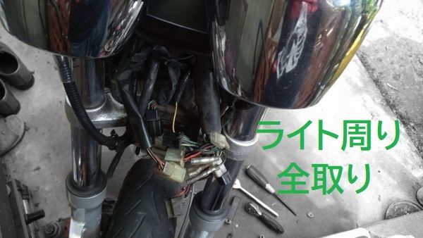 1. ヘッドライトをガバッと開けて中のコネクタ、ギボシ端子をすべて外す。