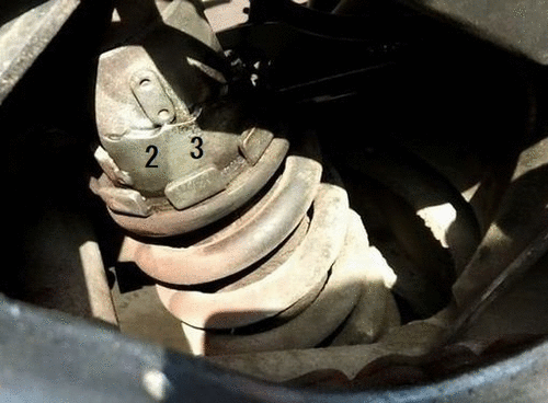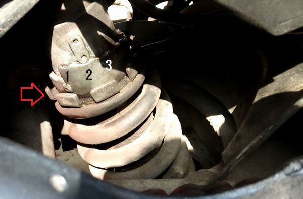 写真、矢印の所がプリロードアジャスター。ここにフックレンチを掛けて回す。