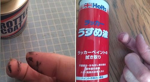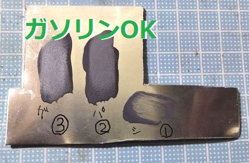 塗布/乾燥のあと、1番シンナー、2番パーツクリーナー、3番ガソリンをそれぞれ垂らし、直後に布で拭く。