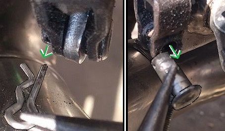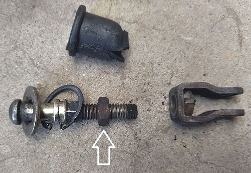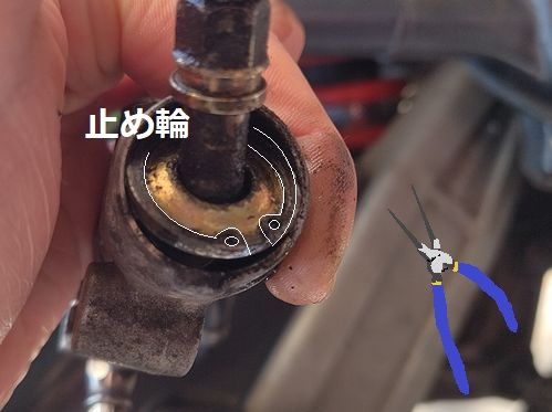 写真右はRピン、純正は割りピンだから曲がった足を伸ばしてから抜く。