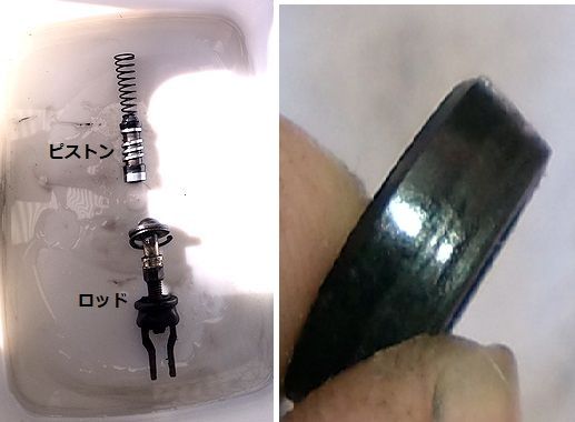 この中国製もピストンの長さは同じ、シリンダーに吸い付くようにフィットしたので使えるとは思う。底部の凹みがやや深いのでブレーキの遊びは要調整かな。