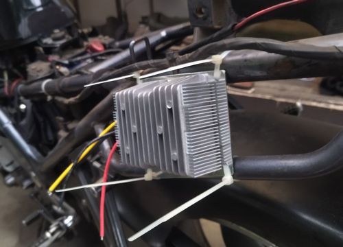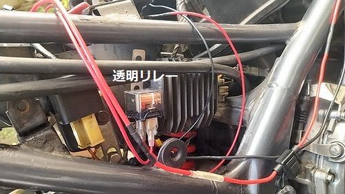 リレーはサイドカバーの下に決定。 汎用ステーをレギュレーターに共締め、差し込む。